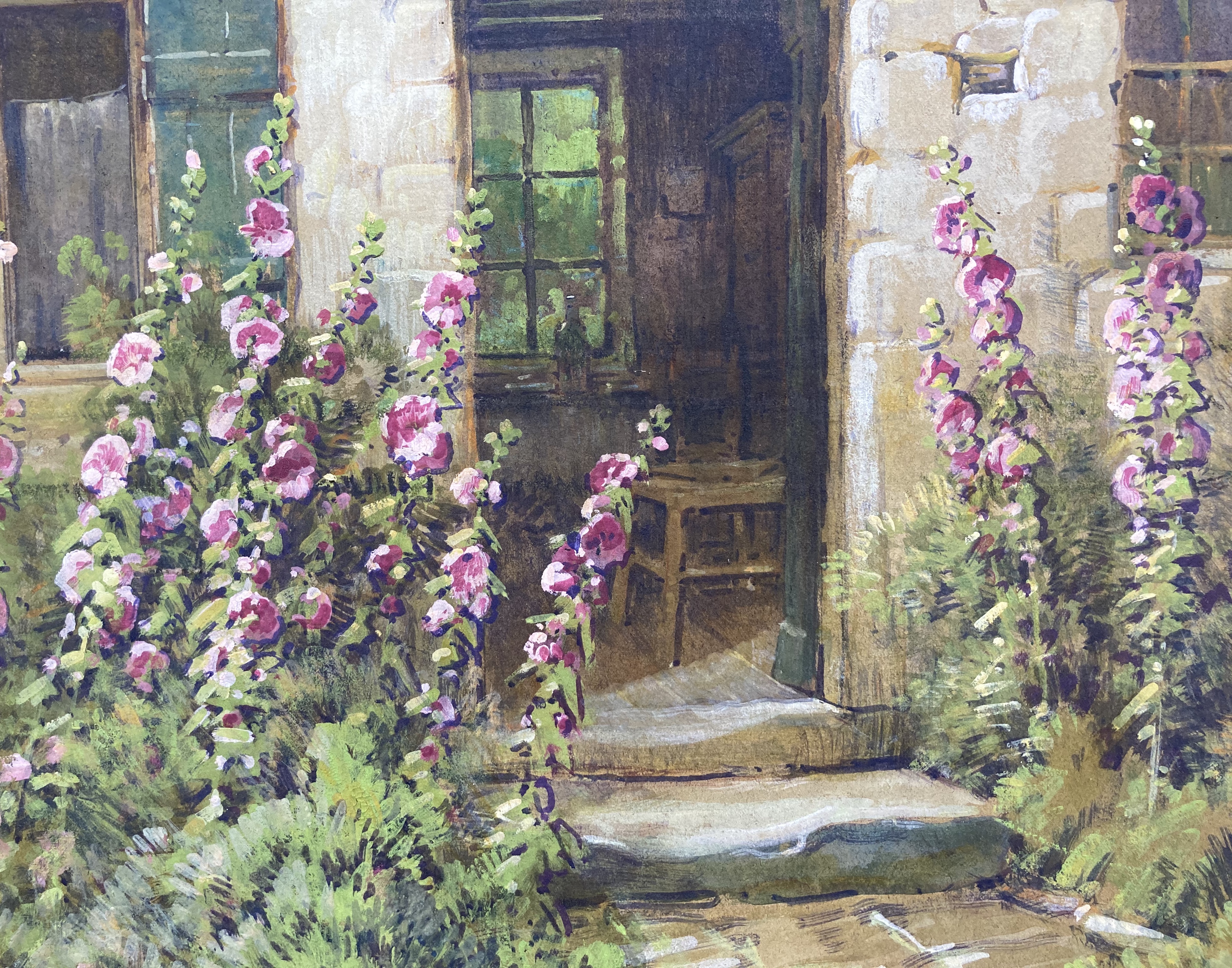 Hollyhocks by a Cottage, R.I. Impressionist, H. A. Dyer, c. 1930