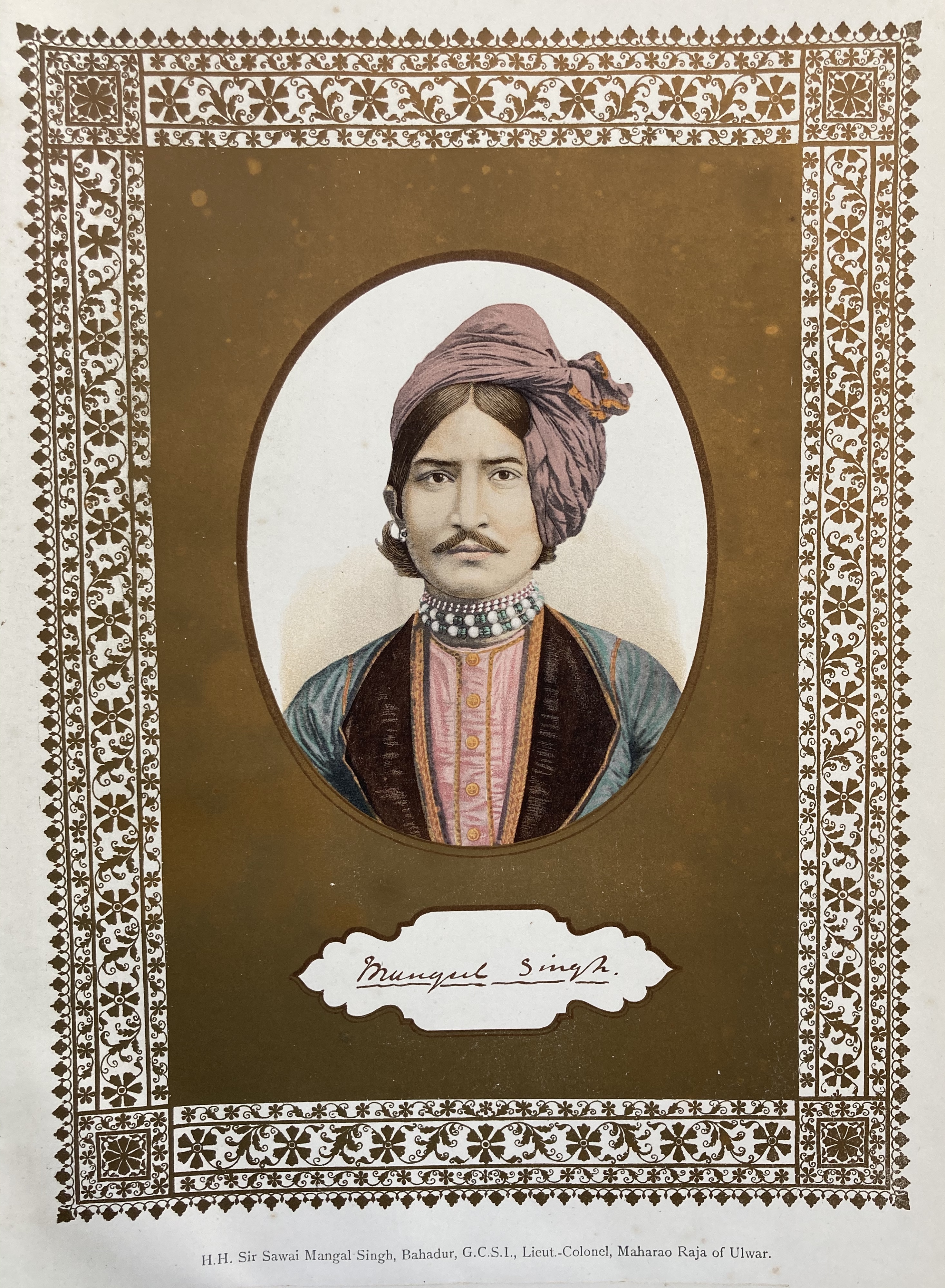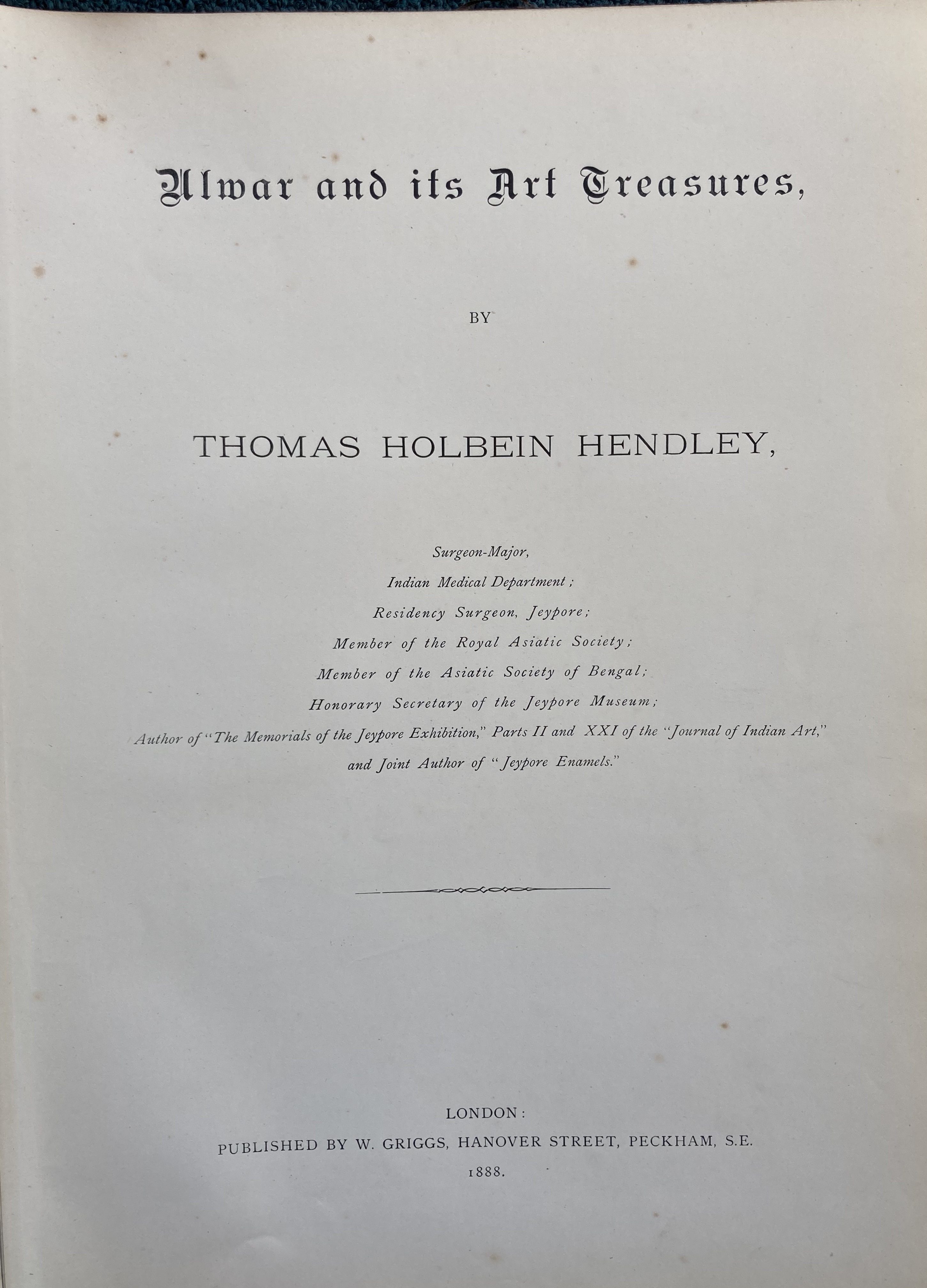 London: W. Griggs, 1888. Folio in cloth binding with gilt title to spine and front board. Elaborate gilt borders and decorations to boards. Top edges gilt. Wear to exterior with tears, chipping and wear to spine. General marks/scuffs as shown and with foxing staining to some pages closest to center. Pages with additional chromolithograph title page, chromolithograph portrait plate and 78 plates. Some age toning and the odd mark/spot here and there, otherwise pages and plates are generally clean as shown. 1888 FIRST ED. ULWAR and its Art Treasures by Thomas Holbein Hendley. London. 1888. W. Griggs. First Edition. Book Size 14. 875 x 11″ ( 38 x 28 cm). LXXIX plates including photos, maps, color chromoliths. Elaborate gilt borders and decorations to boards.